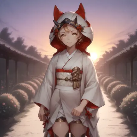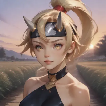 デフォルト衣装: defaultaoi、角、頭巾、額当て、ポニーテール、肩出し、忍者、鎧、背中リボン、