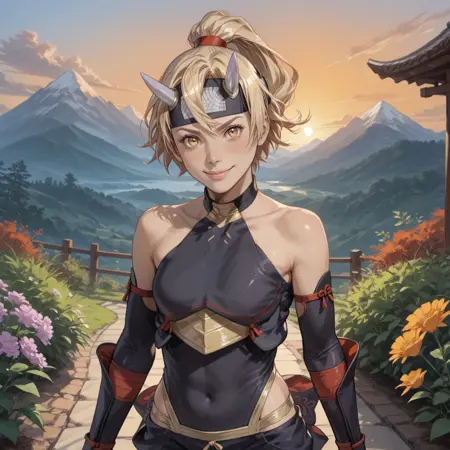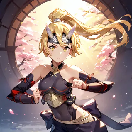 기본 옷차림: defaultaoi, 뿔, 머리띠, 이마 보호대, 단발머리, 어깨 노출, 닌자, 갑옷, 등에 리본,