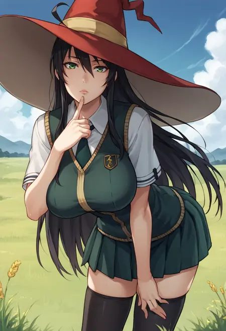 망토가 없는 의상: ["kagariwitch, black hair, green eyes, long hair, ahoge, witch hat, school uniform, sweater vest, necktie, skirt, black thighhighs"]