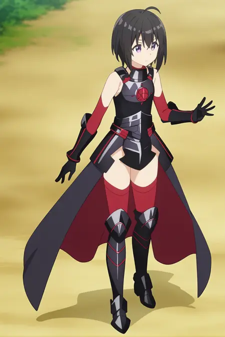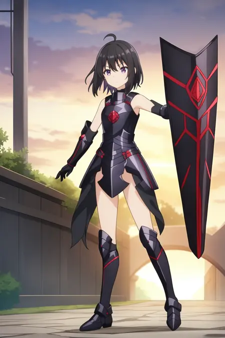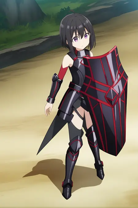 검은 갑옷, 검은 장갑, 검은 부츠, 빨간 소매, 빨간 허벅지 스타킹, 검은 방패