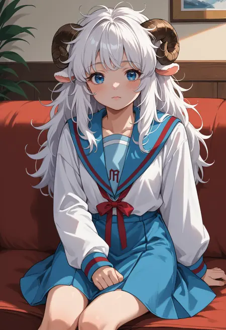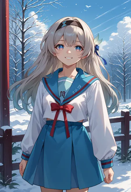 KitaHighFemaleWinter, white shirt, blue sailor collar, long sleeves, red ribbon, blue skirt