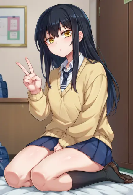 yotsuyamikoSDXL,1girl,long hair,black hair,long sleeves,school uniform,yellow eyes,white shirt,pleated skirt,necktie,collared shirt,miniskirt,sweater,blue skirt,kneehighs