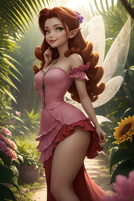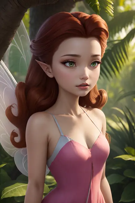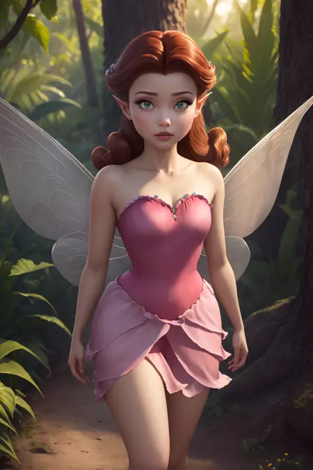 Rosetta, 긴 날개, 분홍색 옷, 밝은 갈색 머리카락, 끝이 말린 헤어스타일, 날카로운 귀, 녹색 눈, 에메랄드색 눈