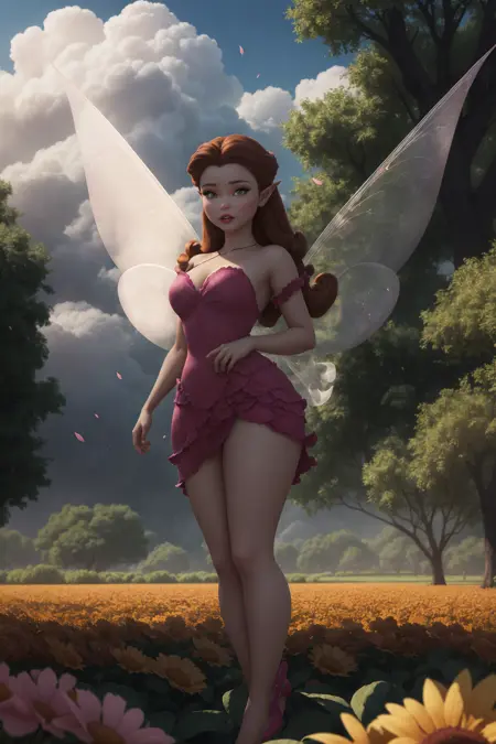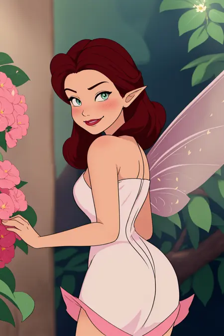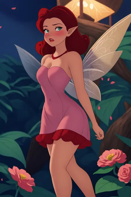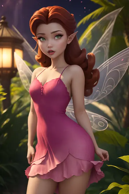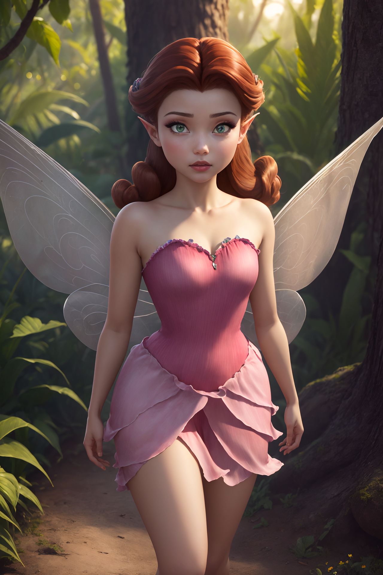 • Rosetta, long wings, pink clothes, Auburn hair, hair curled at the ends, pointy ears, green eyes, emerald eyes,