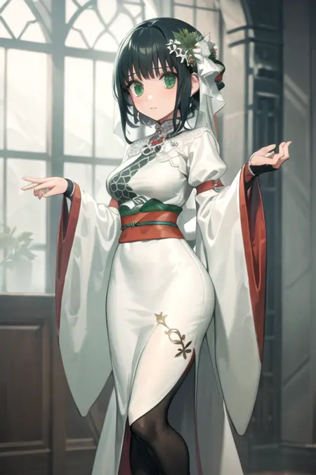 Ototachibana, 1girl, solo, short hair, black hair, hair ornament, long sleeves, white dress, jewelry, green eyes, pantyhose, green hair, hair flower, wide sleeves, sash, bridal gauntlets, black pantyhose