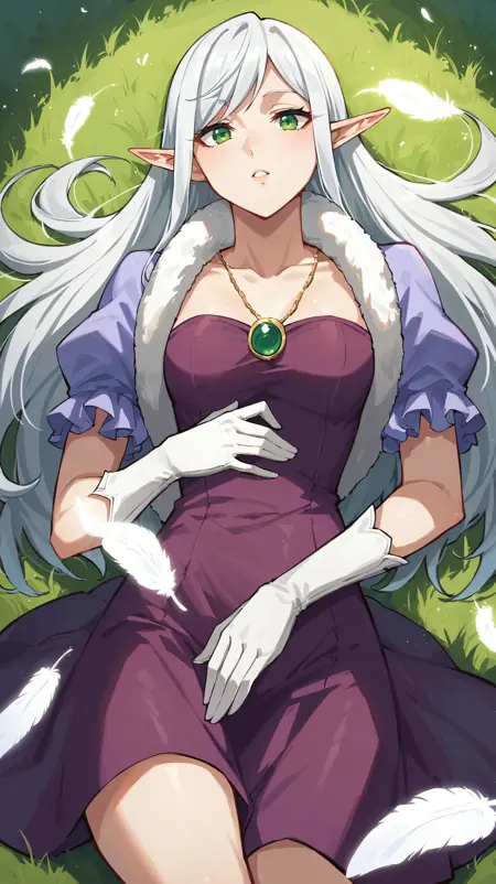 长发,白发,绿眼,尖耳,精灵耳,毛皮领子,白手套,项链,紫色长裙,蓬松袖子,