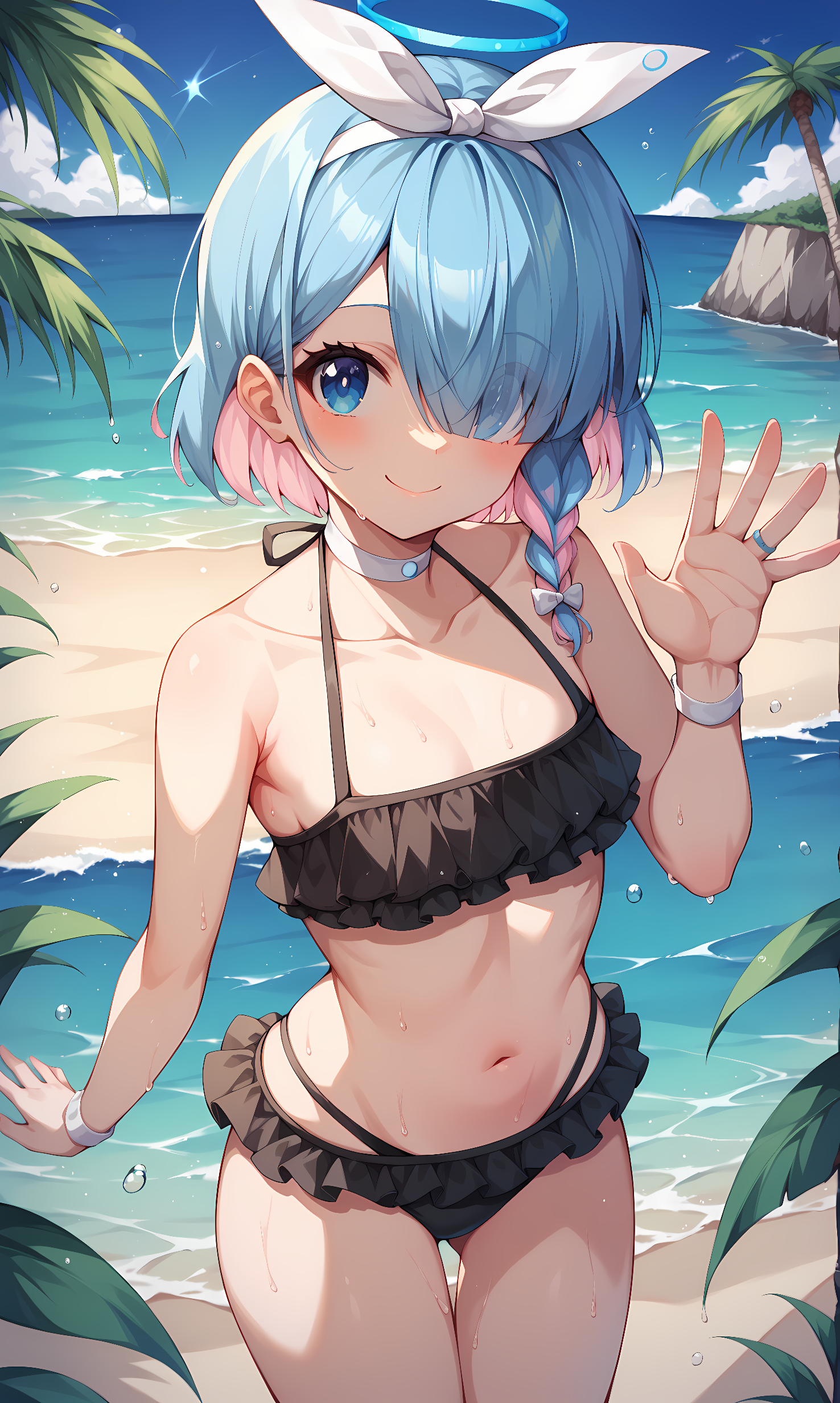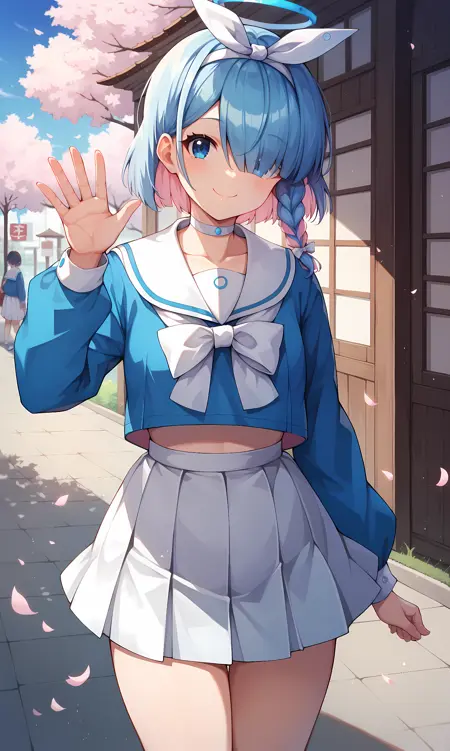 appearance: arona, blue eyes, blue hair, short hair, single braid, hair over one eye, halo, white choker, white hairband