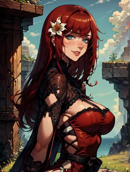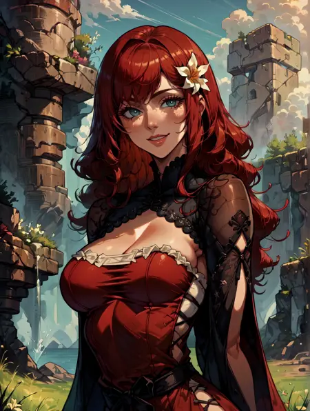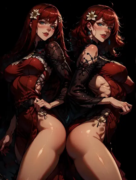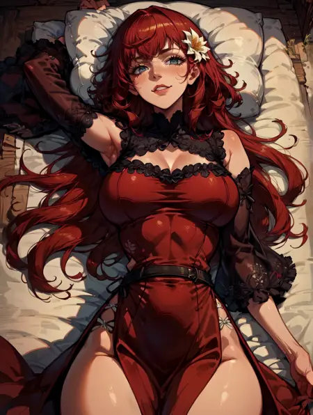 red_dress, cross_laced, black_sleeves, wide_sleeves