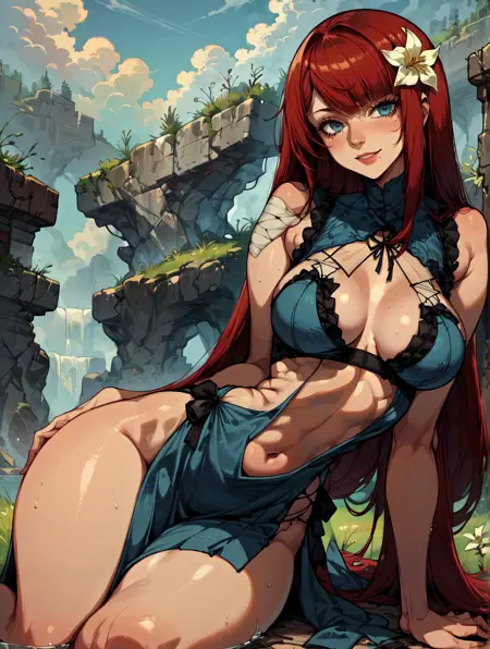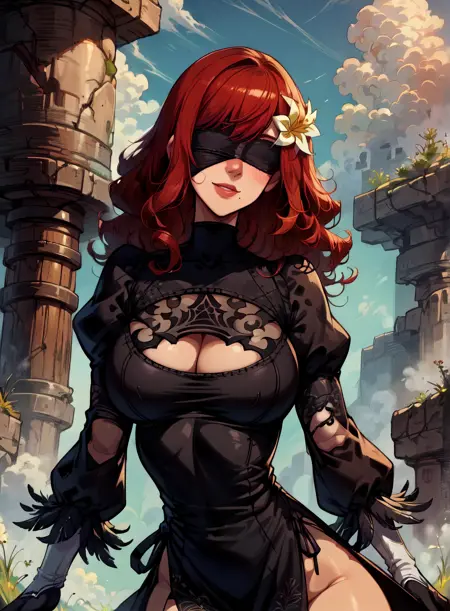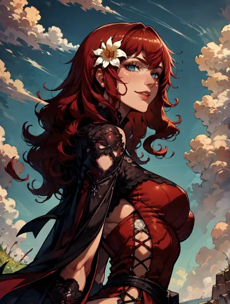 服装关键词:红裙,交叉系带,黑袖,宽袖