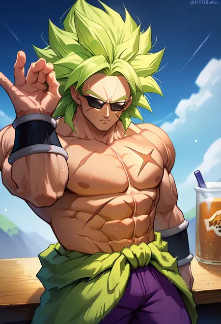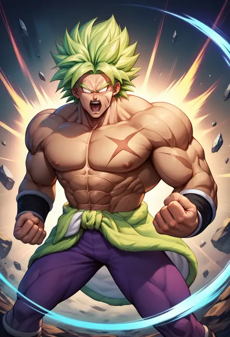 brolyLSS、スーパーサイヤ人、緑髪、とげとげした髪、瞳なし、無表情な目、腹筋、筋肉質、筋肉質な男性、代替筋肉サイズ、上半身裸、顔の傷、胸の傷、胸筋、腰に巻きついた服、紫のズボン
