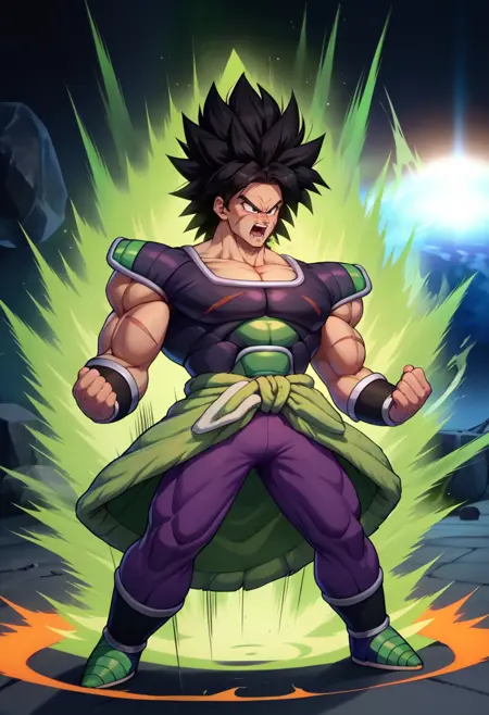 broly、黒髪、ミディアムヘア、とげとげした髪、黒い目、筋肉質な男性、顔の傷、頬の傷、サイヤ人の鎧、胸筋、ぴったりした服、腰に巻きついた服、紫のズボン