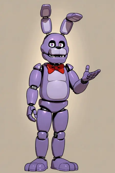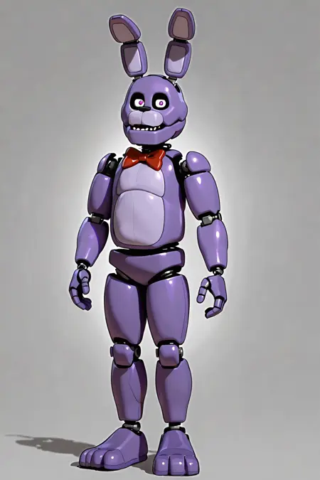 BonnieFNAF1, 1boy, purple-indigo animatronic rabbit, magenta eyes, large rabbit ears, red bowtie, segmented robot joints, weathered metallic appearance, lower teeth, no eyebrows, mecha, bonnie (fnaf),