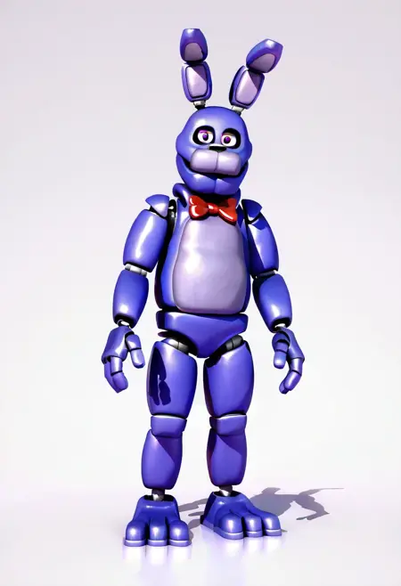 BonnieFNAF, 1boy, indigo-colored animatronic rabbit with blue accents, magenta eyes, squarish muzzle, long articulated ears, red bowtie with a neck strap, robot joints,