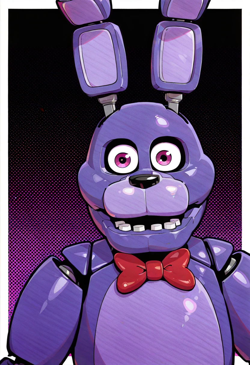 BonnieFNAF1, 1boy, purple-indigo animatronic rabbit, magenta eyes, large rabbit ears, red bowtie, segmented robot joints, weathered metallic appearance, lower teeth, no eyebrows, mecha,