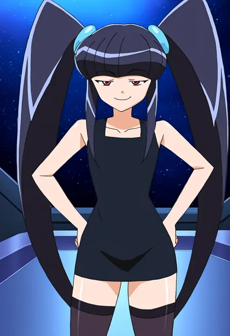 paiway underberg, red eyes, long hair, bangs, black hair, twintails, blunt bangs,