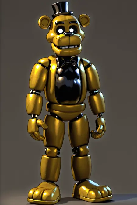 GoldenFreddyFNAF1, 1boy, animatronic golden-yellow bear, black bowtie, small black top hat, white eyes, black sclera, prominent black eyebrows, bottom teeth, visible robot joints, golden freddy,