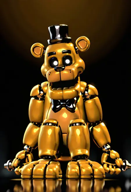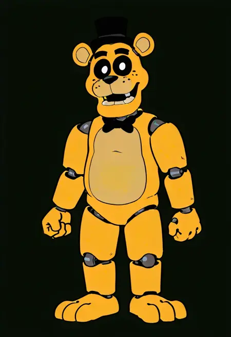 | Trained Words | GoldenFreddyFNAF, 1boy, yellow animatronic bear, classy black top hat, black bow tie with a neck strap, thick black eyebrows, three-toed feet, three black freckles on both sides of muzzle, robot joints, white eyes, black sclera, colored scleraCopied! |