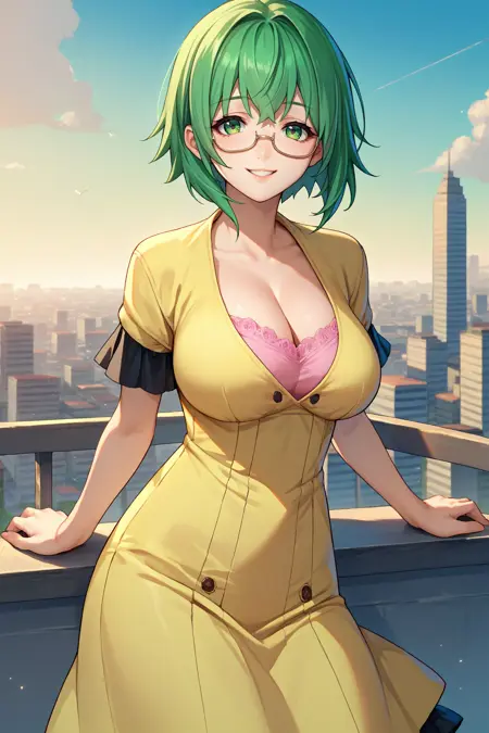 Add "glasses, yellow dress, short sleeves, large breasts, pink bra, cleavage, knee boots, brown boots" for her typical look.