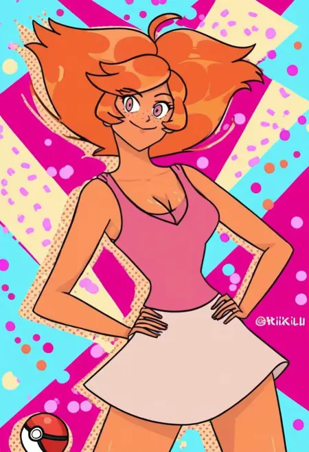 1girl, solo, breasts, short hair skirt, cleavage, medium breasts, tank top, colored skin, pink eyes, freckles, orange hair