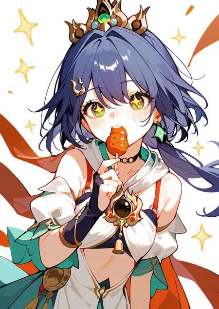 - yunli, crown, fingerless gloves, detached sleeves, thigh strap, anklet