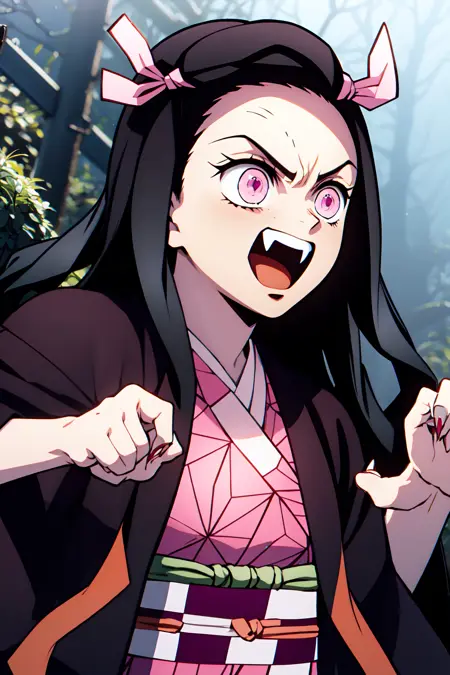 악마: 네즈코뎀, 카마도 네즈코, 1소녀, 검은 머리, 매우 긴 머리, 화난 표정, 정맥, 날카로운 손톱, 분홍색 눈, 1소녀, 하오리, 검은 하오리, 분홍 킴ono, 머리 리본, 분홍 리본, 체크 무늬 띠, 오비,