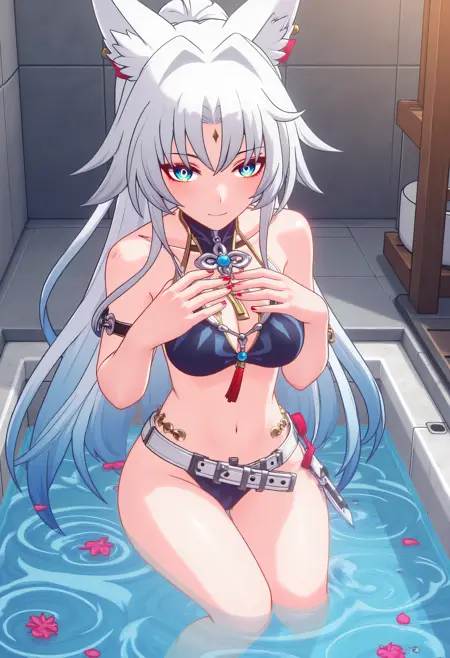 최상의 결과를 위한 캐릭터: 하얀 머리카락, 매우 긴 머리카락, 그라데이션 머리카락, 파란 머리끝, 꼬리머리, 아쿠아마린 눈, 빨간 아이라인, 동물 귀, 귀걸이, 이마 마크,
