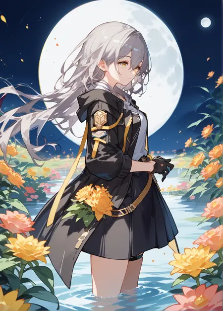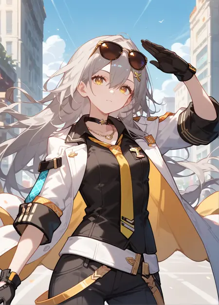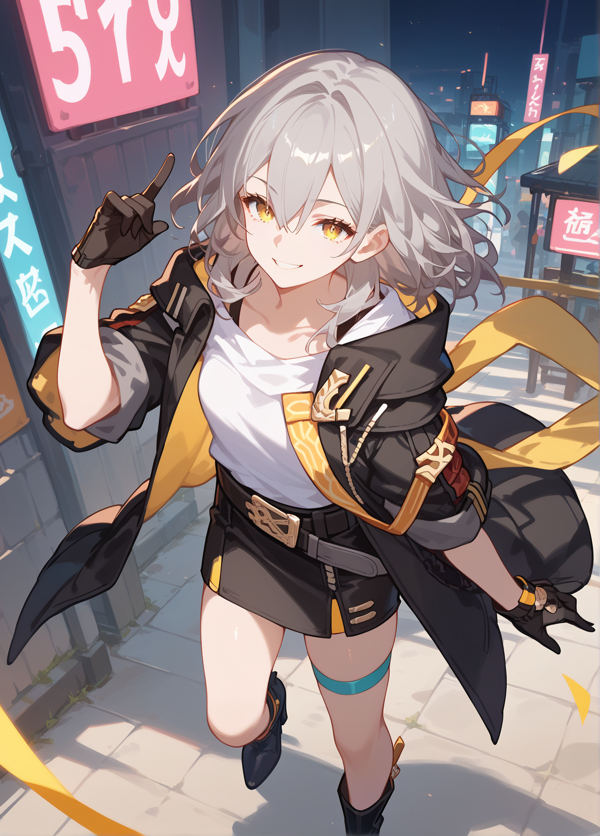 stelle, 긴 머리, 회색 머리, 눈 사이의 머리카락, 앞머리, 노란 눈, 흰 셔츠, 검은 재킷, 검은 치마, 벌어진 옷, 검은 장갑, 검은 신발, 부츠, 하이힐, 벨트, 허벅지 스트랩,