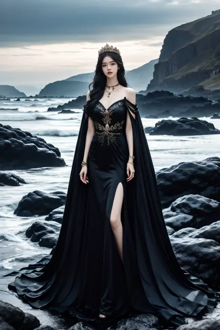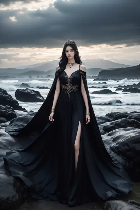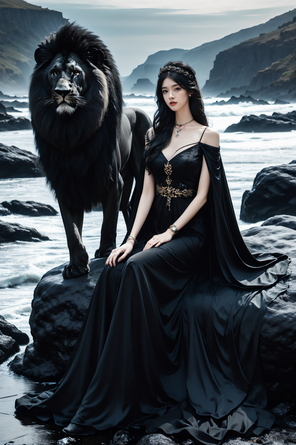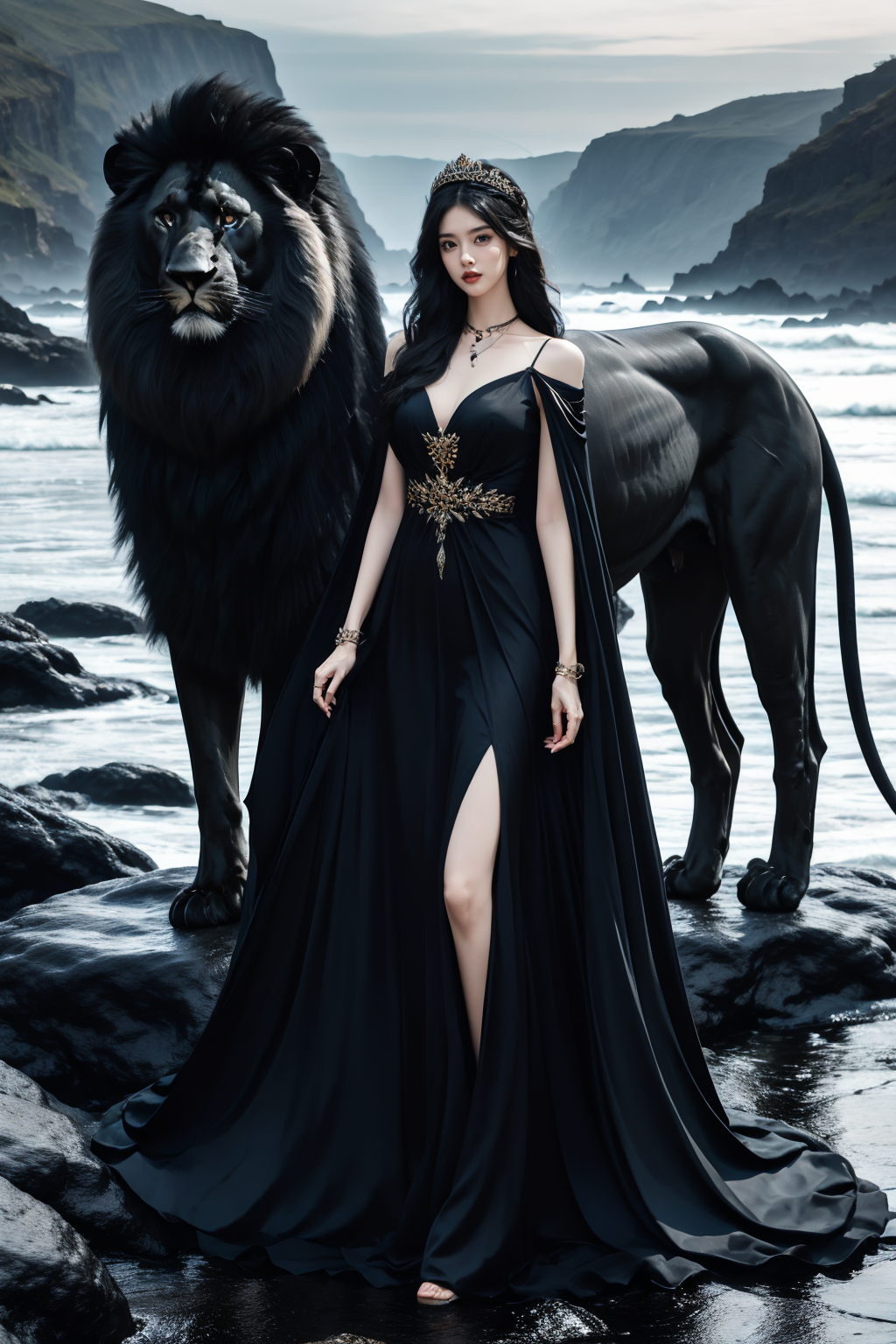 1소녀, 드레스, 검은 드레스, 검은 머리, 뒤에 검은 사자, 보석, 왕관, 흐린 하늘, 구름, 야외, 팔찌, 회색 하늘, 망토, 긴 머리, 긴 드레스, 전체 몸, 서 있음, 걷고 있음, 동물, 사실적, 하늘, 보는 이를 바라봄, 검은 사자 여왕, <lora:JAY - BLACK LION QUEEN:0.8>