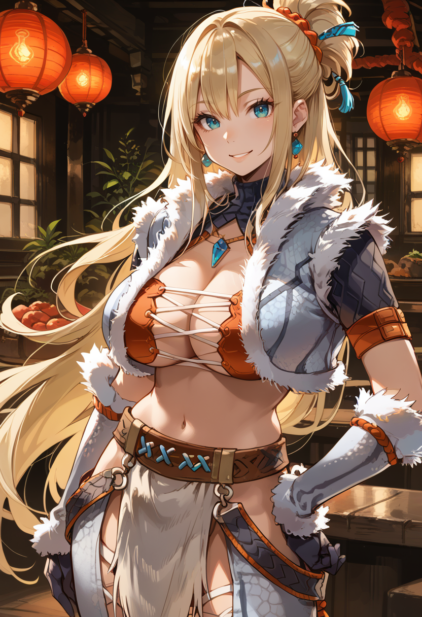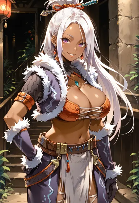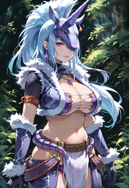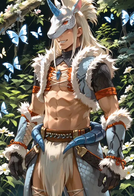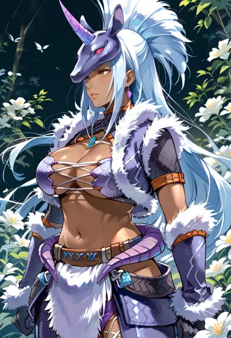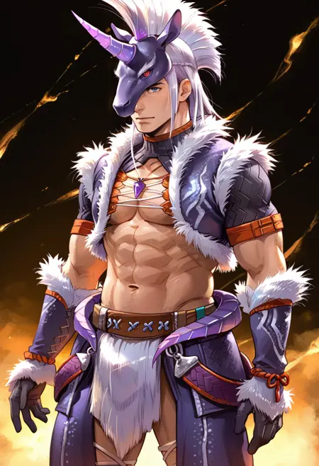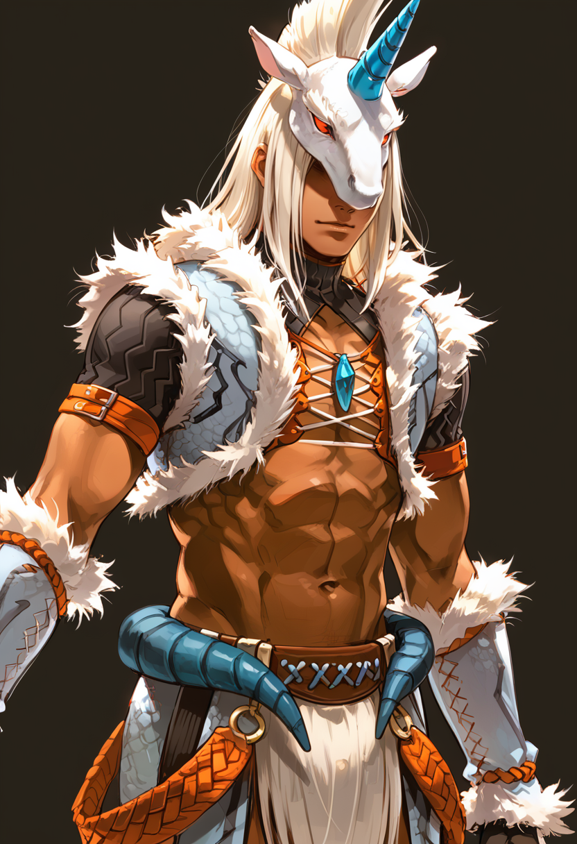 タグ(衣装 - 白):キリンアーマー、白い動物の角マスク、白い毛皮縁のジャケット、白い肘手袋、白いズボン、白い腰布、黒いブーツ、