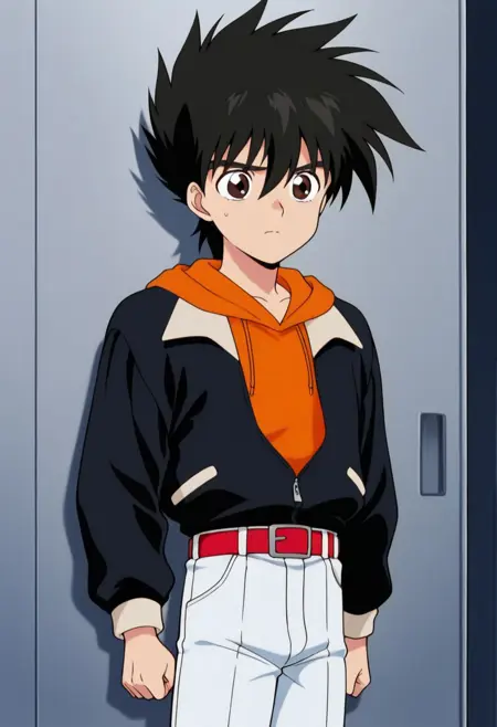 hayatokazami, 1boy, male focus, solo, brown eyes, black hair, hoodie, orange hoodie, hood, jacket, black jacket, partially unzipped, belt, red belt, pants, white pants,