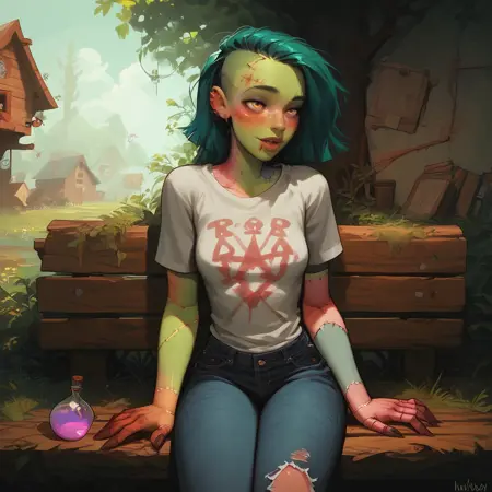 <lora:Zombie_girl_LASCALAE:1>, z0mb13_g1rl_lascalae, zombie girl, green skin, stitches, 1girl,