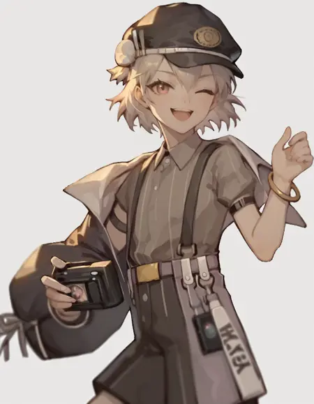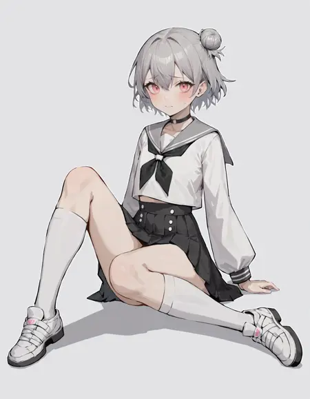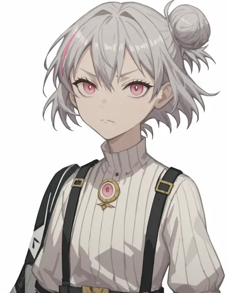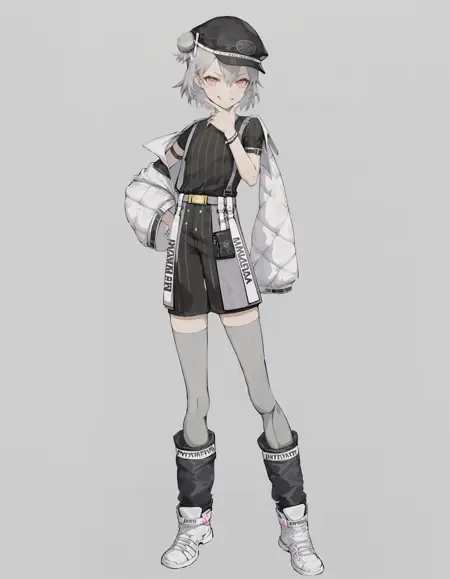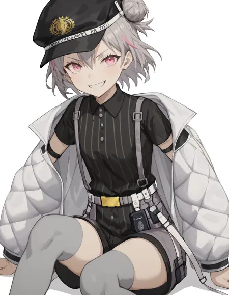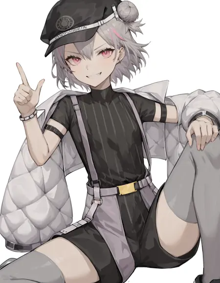 duominixi,1girl,solo,shirt,hat,grey hair,black headwear,shorts,hair bun,short hair,pink eyes,jacket,black shorts,black shirt,jewelry,grey thighhighs,