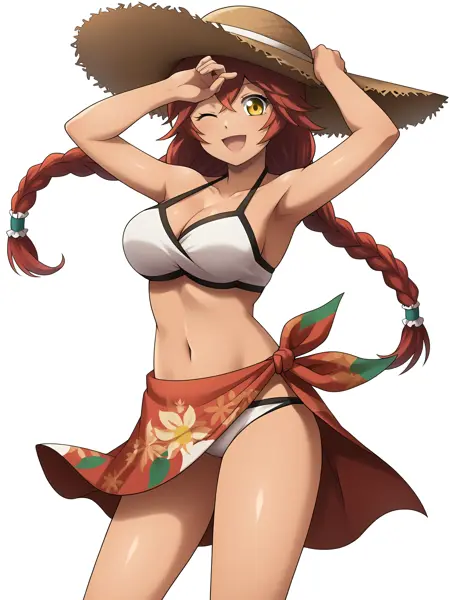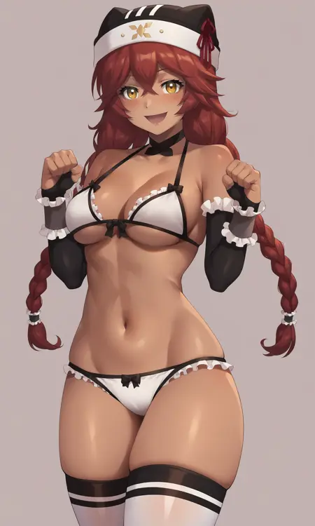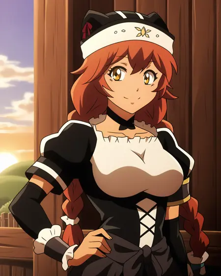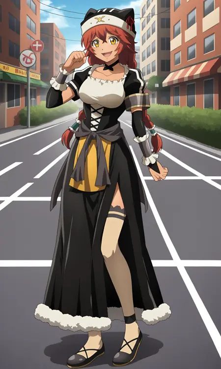 Tags: red_hair, twin_braids, long_hair, hair_tubes, yellow_eyes, hair_between_eyes, dark_skin, dark-skinned_female