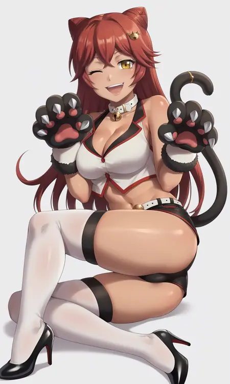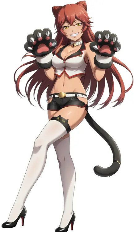 베스트 고양이: white_vest_crop_top, Lupusregina_Beta, hair_bun, double_bun, alternate_hairstyle, loose_hair_strand, long_hair, bare_shoulders, sleeveless, white_collar, neck_bell, black_gloves, animal_hands, claws, cat_paws, cat_tail, tail_ornament, black_shorts, white_belt, hip_vent, micro_shorts, white_legwear, shoes, black_footwear, high_heels, paw_pose
