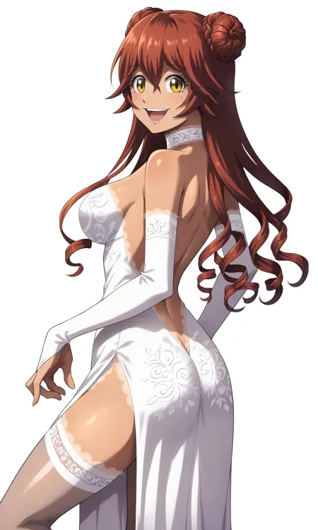 웨딩 드레스: white_wedding_lace-trimmed_strapless_dress, Lupusregina_Beta, double_bun, loose_hair_strand, long_hair, curly_hair, white_choker, lace-trimmed_choker, bare_shoulders, bride, long_dress, white_bridal_gauntlets, navel, white_garter_straps, white_legwear, see-through_legwear, lace-trimmed_legwear, sandals, white_footwear, strappy_heels
