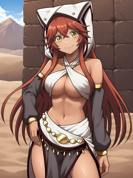 하렘 복장: harem_outfit_grey_animal_hood, Lupusregina_Beta, underboob, loose_hair_strand, long_hair, gold_jewelry, white_halterneck, white_halter, criss-cross_halter, bare_shoulders, detached_sleeves, grey_sleeves, skimpy, red|grey_pelvic_curtain, white_loincloth, toeless_footwear, white|red_boots, sandals, knee_boots, revealing_clothes
