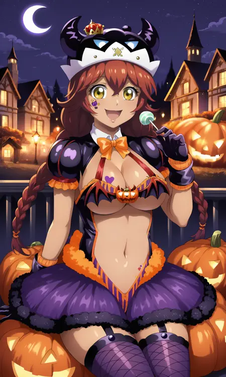 할로윈 복장: purple_halloween_costume_revealing_clothes_purple_sleeves_puffy_short_sleeves, Lupusregina_Beta, sleeveless, underboob, demon_hat, mini_crown, orange_bowtie, heart_tattoo, breast_tattoo, purple_gloves, fur-trimmed_gloves, half_gloves, purple_skirt, boots, frilled_skirt, clothing_cutout, miniskirt, layered_skirt, demon_tail, purple_legwear, fishnet_legwear, garter_straps, purple_footwear, pointy_footwear, high_heels