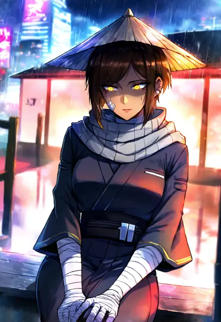 OutisHeishou, yellow eyes, shaded face, samurai, black asian conical hat, grey scarf, black kimono, black hakama, black belt, bandaged leg, bandaged hand