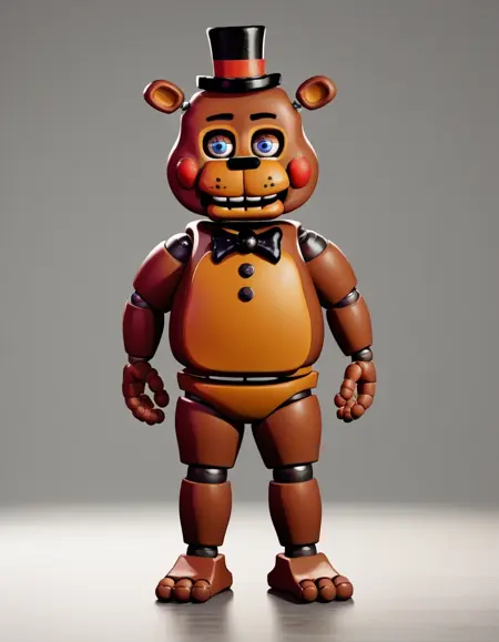 Toy_FreddyFNAF, blue eyes, 1boy, hat, bow, animal ears, bowtie, no humans, black bow, robot, mini hat, black bowtie, top hat, joints, furry male, mini top hat, chubby, fat, red rosy cheeks, brown fur, animatronic, robot joints