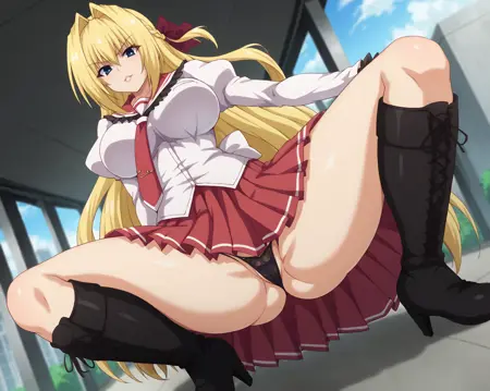 制服、フリル、白いシャツ、長いふくらはぎの袖、腕章、赤いネクタイ、赤いリボン、白いウェストリボン、赤いスカート、レースアップブーツ