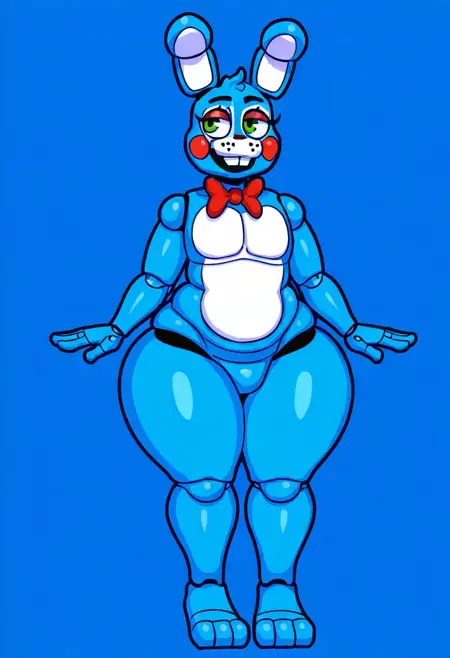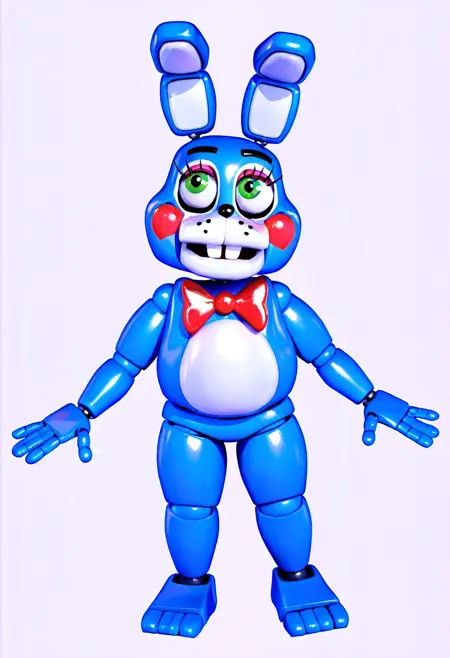 ToyBonnieFNAF, 1boy, bright shiny blue body, white skin, two tone skin, green eyes, magenta eyelids, long eyelashes, rosy red blushed cheeks, white circular tail, black eyebrows, rabbit ears, robot joints, buck teeth, red bowtie,
