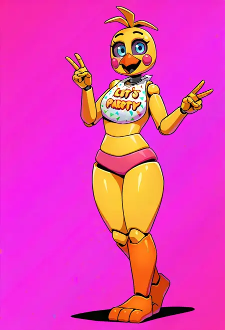 ToyChicaFNAF2, 1girl, animatronic chicken, yellow body, blue eyes, pink rosy cheeks, pink panties, bib, orange beak, purple eyelids, orange feet, curvy, robot joints