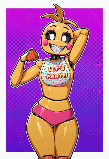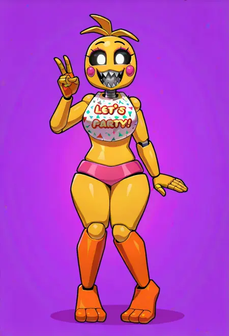 ToyChicaFNAF2, 1girl, animatronic chicken, yellow body, white eyes, black sclera, pink rosy cheeks, pink panties, bib, sharp teeth, purple eyelids, orange feet, curvy, robot joints,