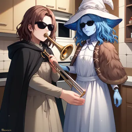WhenMamaIsntHomeMeme, playing instrument, music, sunglasses, indoors, trumpet, kitchen