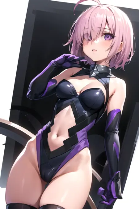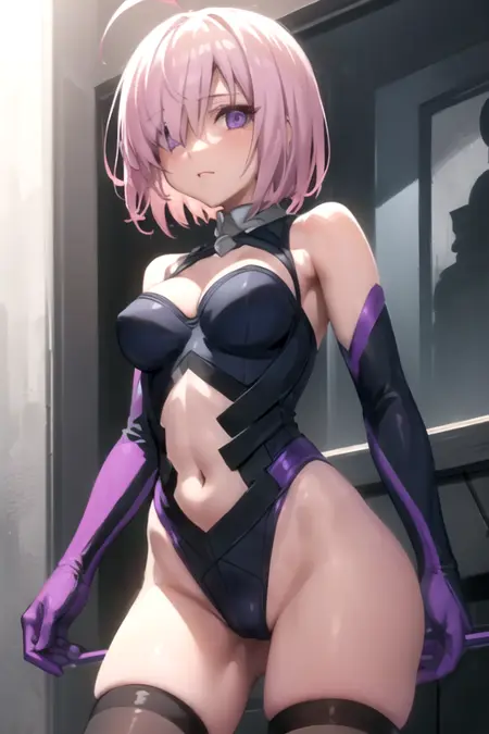| Trained Words | MashShi3ld, 1girl, solo, short hair, medium breasts, black thighhighs, purple gloves, navel, cleavage, bare shoulders, purple eyes, purple hair, ahoge, elbow gloves, armor, hair over one eye, black leotard, highleg leotard, cleavage cutout, light purple hair, navel cutout, metal collar, mash kyrielightCopied! |
