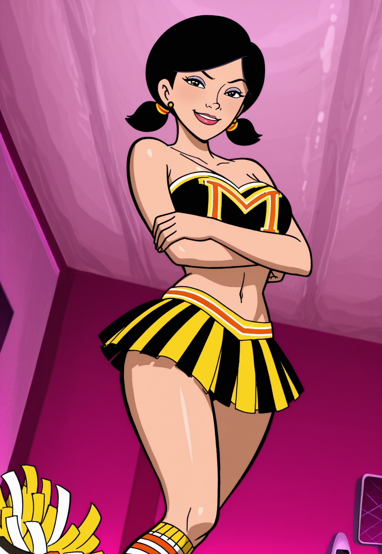 关于她的啦啦队制服,露脐上衣和百褶裙是可选标签,除非它们没有显示出来,否则通常不需要;她的君主装束中的斗篷也同理。
