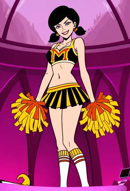 关于她的啦啦队制服,露脐上衣和百褶裙是可选标签,除非它们没有显示出来,否则通常不需要;她的君主装束中的斗篷也同理。
