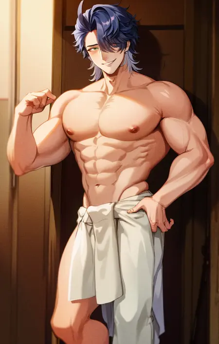 上部のストラップ部分はかなり強めに仕上げています。ただ、このキャラクターに関しては、この服装やヌード以外のアートが見つかりませんでした。この荒々しい男は腰回りを披露するのが好きだし、止めることもありません。