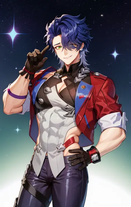 'toned male, Sampo Koski (Honkai Star Rail), red jacket, white shirt, pants' – 通常の衣装用の例プロンプト。