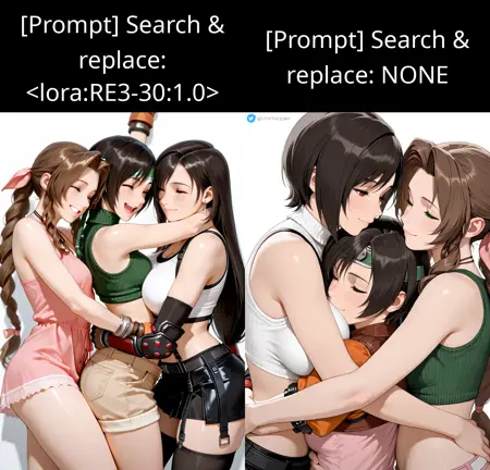 该LoRA可不使用触发词,直接作为风格LoRA使用(示例图像:Tifa、Aerith和Yuffie三人拥抱在一起)